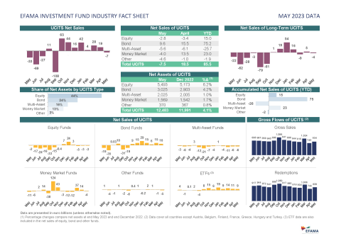 EFAMA has today published its latest monthly Investment Fund Industry Fact Sheet, which provides net sales data on UCITS and AIFs for May 2023, at European level and by country of fund domiciliation.