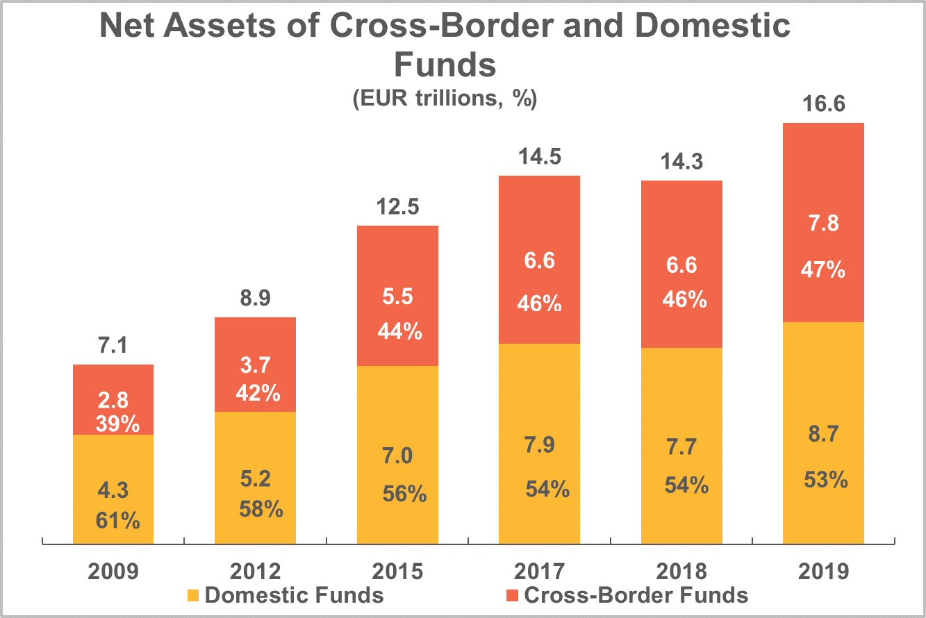 Net assets of cross-border funds have grown significantly over the last decade, from EUR 2.8 trillion in 2009 to EUR 7.8 trillion at the end of 2019. In recent years, this growth has been driven by strong net sales of cross-border funds outside of Europe, accounting for about half of total fund sales in 2018 and 2019.