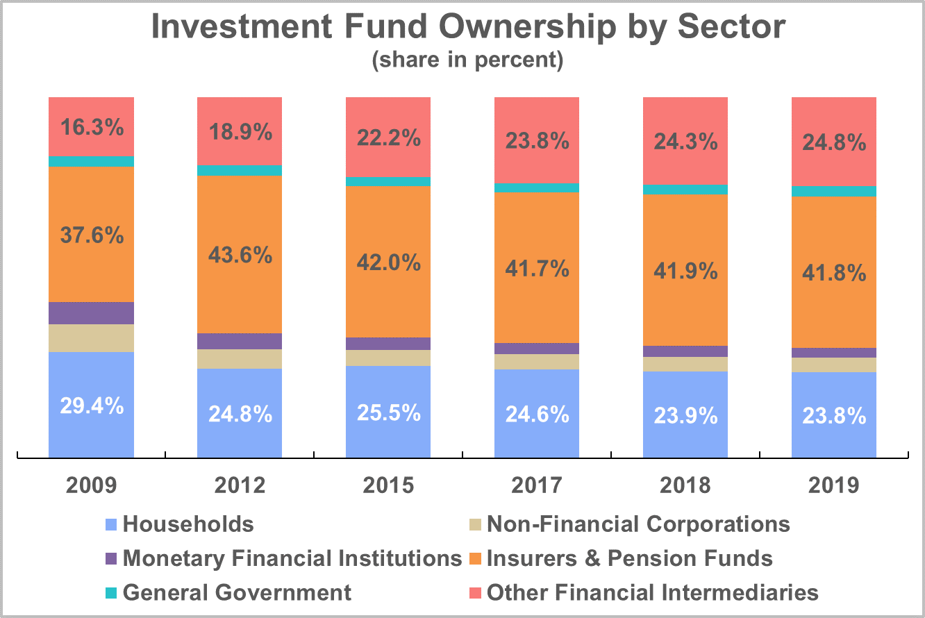Institutional investors are by far the largest investors in investment funds. Insurers and pension funds accounted for almost 42% of total investment fund ownership at the end of 2019, and this share has increased in recent years. Retail investors, on the other hand, accounted for only 23.8% of fund ownership and their share has declined steadily these past years.