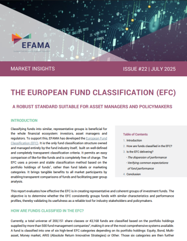 The European Fund and Asset Management Association (EFAMA) has released today a new issue of its Market Insights series titled “The European Fund Classification (EFC) - A robust standard suitable for asset managers and policymakers”. This publication provides a comprehensive evaluation of the EFC and its value as a reliable, industry-led standard for classifying investment funds.