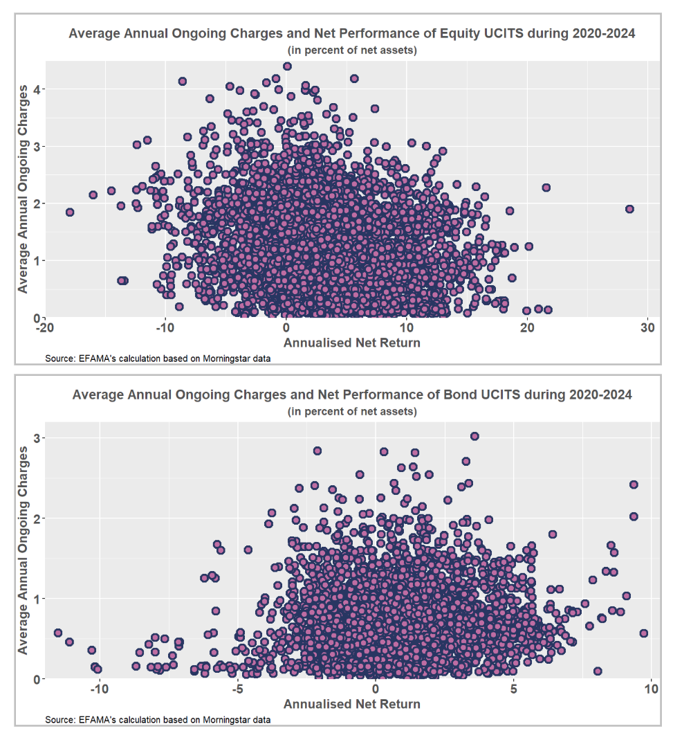 The charts suggest that selecting the right fund is critical, given the broad disparity in net performance across the UCITS universe. The table below reinforces this, by comparing average net performance of different equity and bond fund categories. For example, between 2020 and 2024, Technology Equity UCITS delivered an average net return of 16.61%, while Europe Mid/Small-Cap Equity UCITS returned just 1.17%. This disparity shows that investment strategy has a far more significant impact on returns than fund cost alone. Cost becomes a meaningful decision-driver only when comparing funds with similar investment strategies and objectives.