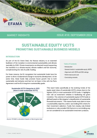 Today, the European Fund and Asset Management Association (EFAMA) published the latest edition of its Market Insights series, titled “Sustainable equity UCITS: promoting sustainable business models”. This publication provides an in-depth analysis of the trends and dynamics within the sustainable equity UCITS market, covering the rapid growth in net assets and the evolving investor landscape over recent years.