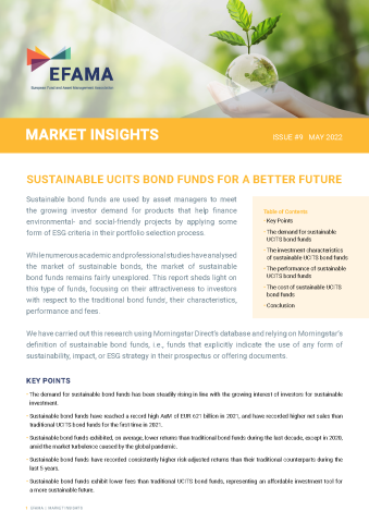 EFAMA released today a new issue of its Market Insights series titled ‘Sustainable UCITS Bond Funds for a Better Future'. This report highlights the strong demand for UCITS bond funds that apply ESG strategies in their portfolio selection, confirming the growing interest of investors for ESG products. It analyses the investment characteristics of this type of funds and compares their performance and fees with those of traditional bond funds.