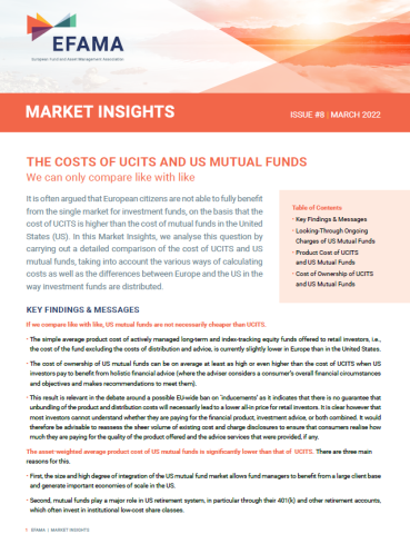 EFAMA released today issue number eight of its Market Insights series titled 'The Costs of UCITS and US Mutual Funds - We can only compare like with like'. This report compares the costs of UCITS and US mutual funds, taking into account various cost calculating methods, as well as the differences in fund distribution between Europe and the US.